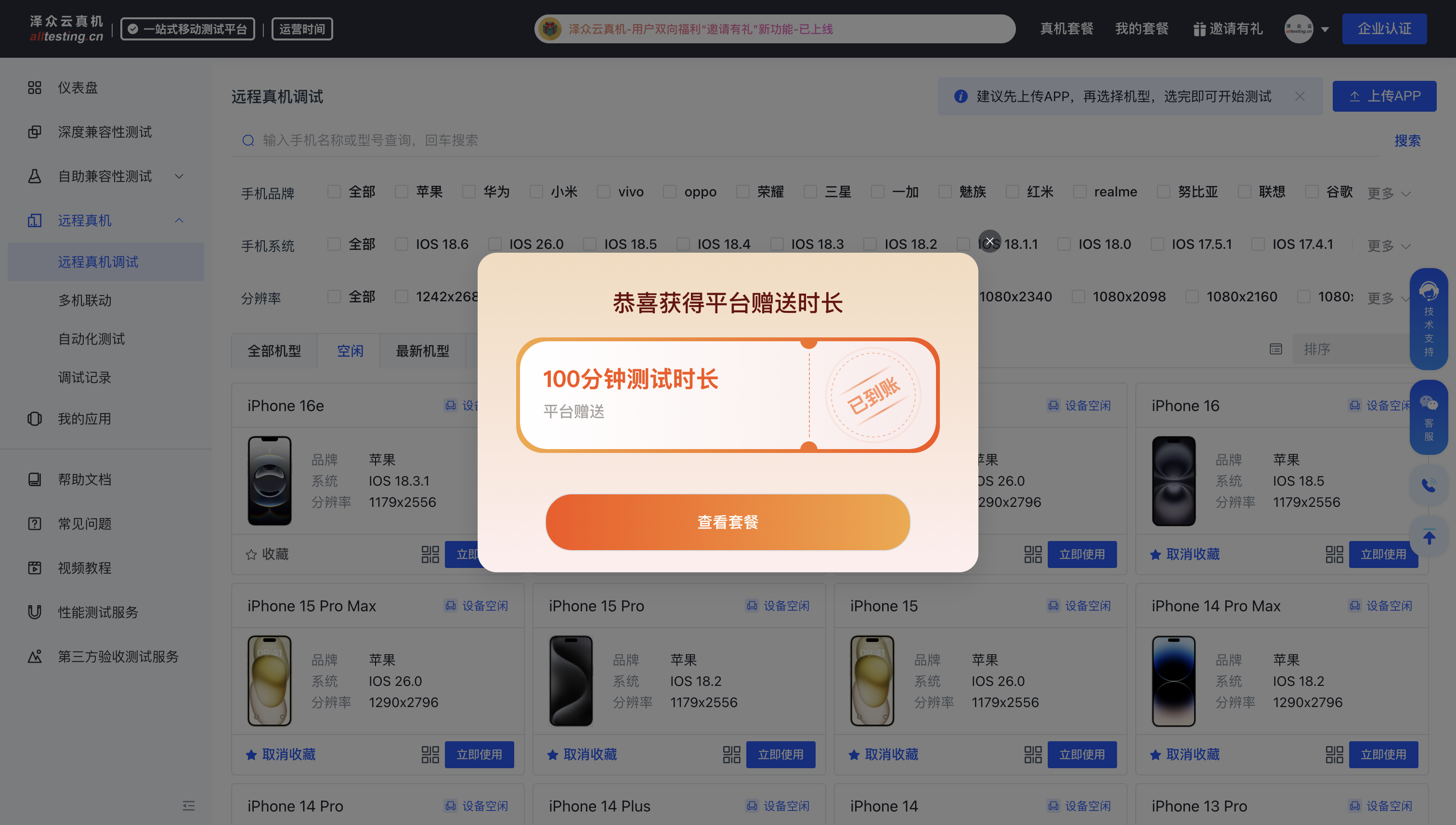 澤眾云真機為了讓更多的用戶免費體驗自助兼容性測試服務,2025年9月8日之前注冊用戶,在2025年9月8日到2025年9月30日登錄云真機平臺,系統(tǒng)將隨機派送30-100分鐘VIP自助兼容性測試時長套餐,平臺用戶僅有一次機會,秒送自動到賬。