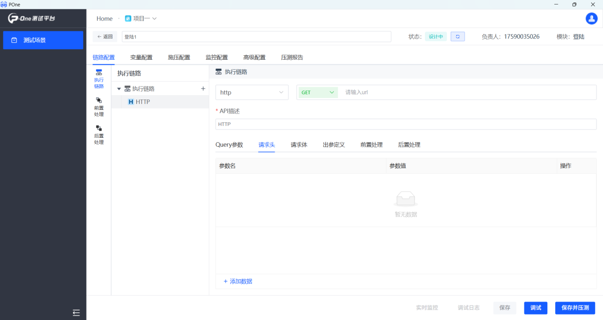 3.添加腳本后,進(jìn)入鏈路配置頁(yè)面,進(jìn)行壓測(cè)配置修改并選擇壓力機(jī);