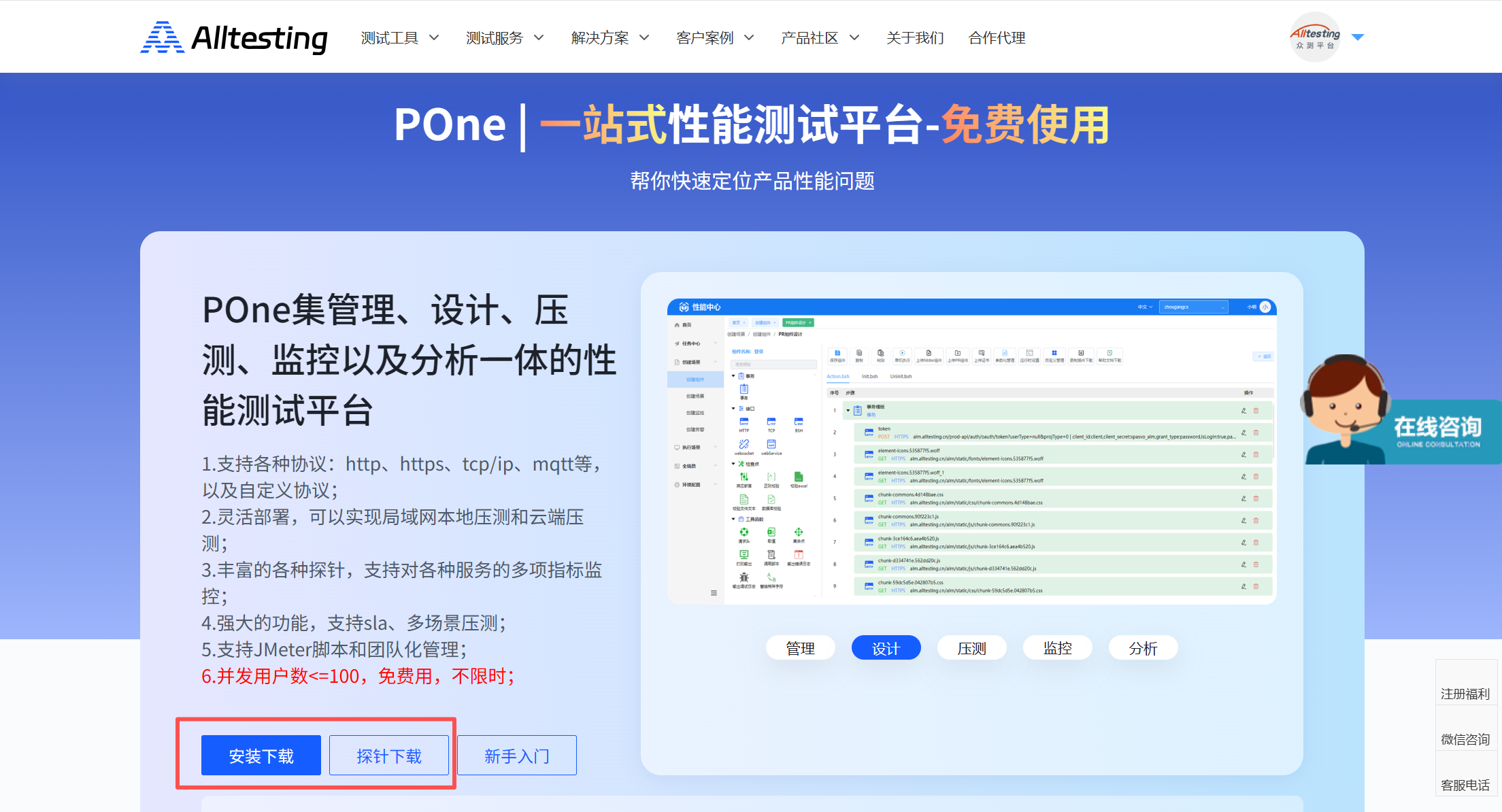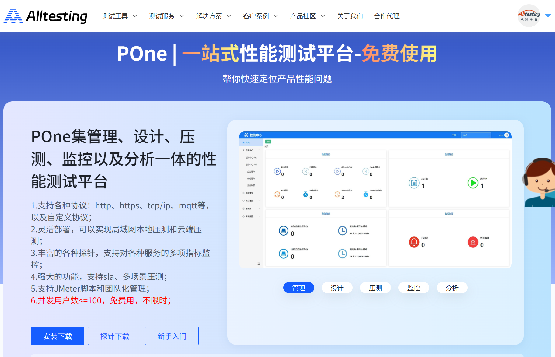 國(guó)內(nèi)在線性能測(cè)試服務(wù)的平臺(tái)也很多,大部分平臺(tái)技術(shù)框架都是云端壓測(cè),不支持本地化部署,Alltesting平臺(tái)POne性能測(cè)試服務(wù)完美解決了這個(gè)問(wèn)題,且你在開(kāi)發(fā)調(diào)試時(shí),測(cè)試并發(fā)100VUM內(nèi)免費(fèi)使用,不記次數(shù),不計(jì)費(fèi)哦。