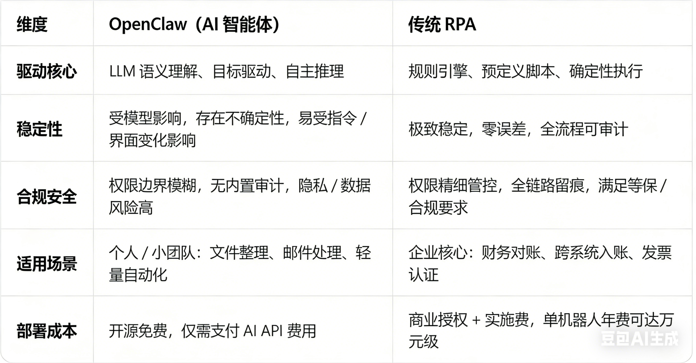 穩(wěn)定性無法滿足核心需求:RPA 執(zhí)行結(jié)果 100% 可預(yù)期,適合不容出錯(cuò)的底層流程;OpenClaw 依賴 LLM 推理,結(jié)果存在波動(dòng),難以保障關(guān)鍵業(yè)務(wù)零差錯(cuò)。