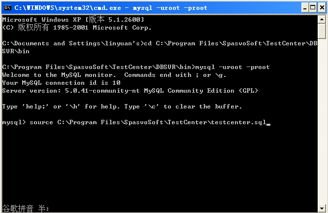 c)進(jìn)入mysql后可以導(dǎo)入TestCenter數(shù)據(jù)庫文件testcenter.sql 了,輸source C:Program FilesSpasvoSoftTestCenter estcenter.sql;