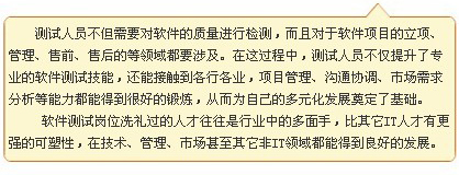 據(jù)前程無憂招聘網(wǎng)統(tǒng)計,目前,國內120萬軟件從業(yè)人員中,真正能擔當軟件測試職位的不超過5萬人,軟件測試人才缺口已超過20萬并向30萬大關急速挺進。在中華英才網(wǎng)近期發(fā)布的2007十大熱門職業(yè)中,軟件測試工程師也位居三甲之列。>>