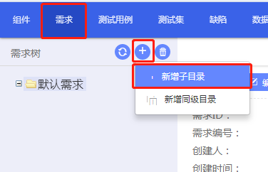 在默認(rèn)需求下添加需求只能通過(guò)“新增子目錄”進(jìn)行添加,當(dāng)默認(rèn)需求下存在子需求時(shí),我們可以選中一個(gè)子需求,點(diǎn)擊“新增同級(jí)目錄”,新增與該子需求同級(jí)的需求。