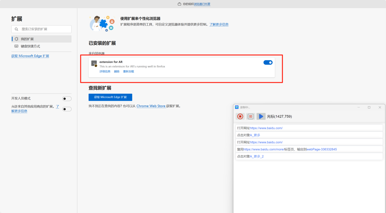 客戶端通過 Edge 瀏覽器擴展,進行 RPA 流程錄制、回放等操作場景,均可享受該自動安裝插件功能帶來的便捷與高效。