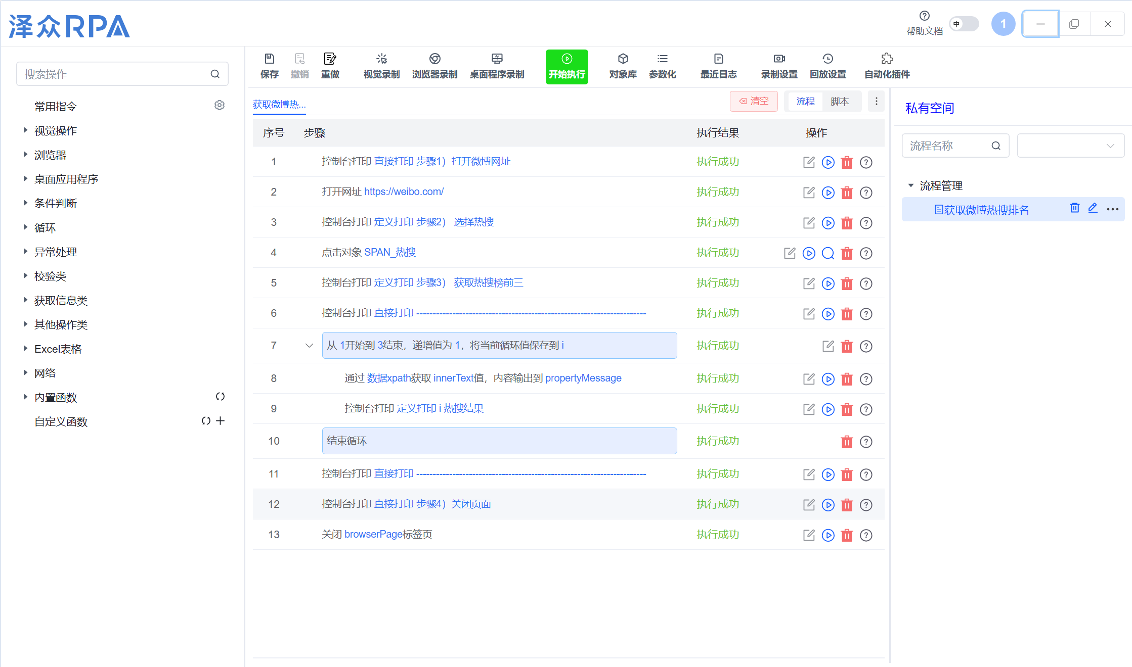 新用戶首次接觸澤眾 RPA ,無需自己摸索搭建流程?!精@取微博熱搜排名】demo 流程直接復制到個人空間,打開就能看到完整的操作步驟,像 “打開微博網(wǎng)址、點擊熱搜、獲取熱搜榜前三名” 等可視化流程,清晰展示 RPA 如何與瀏覽器交互、提取數(shù)據(jù)。新用戶跟著流程跑一遍,能快速理解 RPA 指令邏輯,輕松邁出自動化操作第一步,原本可能需要花時間學習的基礎使用,現(xiàn)在簡單體驗 demo 就懂了。