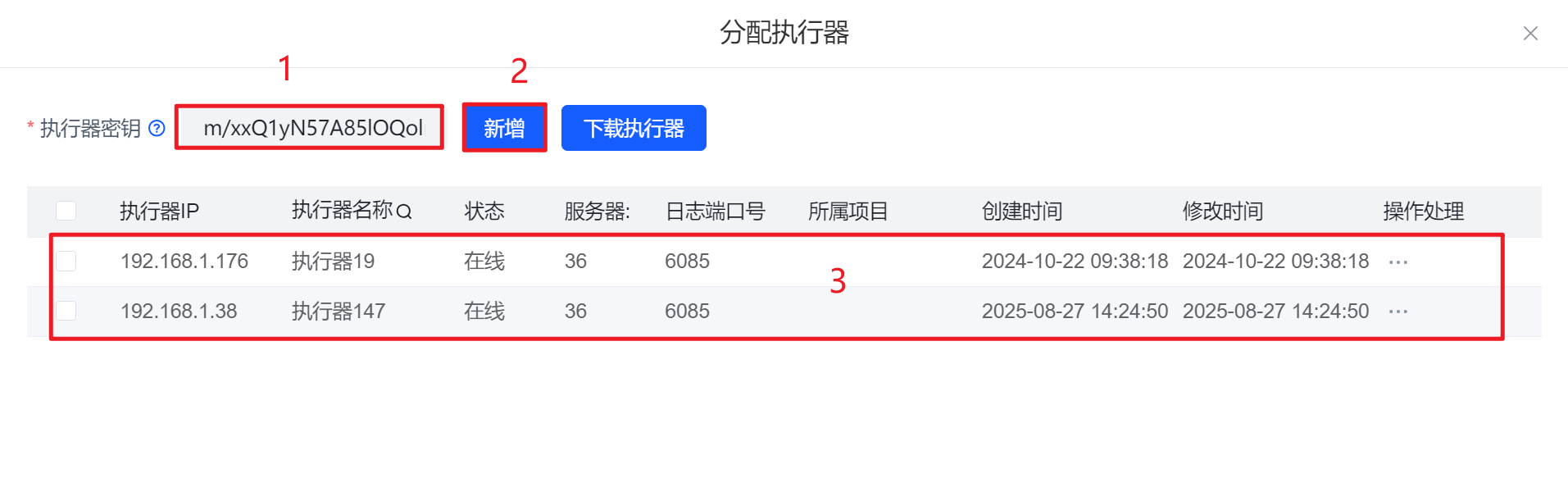 輸入復(fù)制的密鑰,點(diǎn)擊新增按鈕,下方出現(xiàn)執(zhí)行器后表示綁定成功。