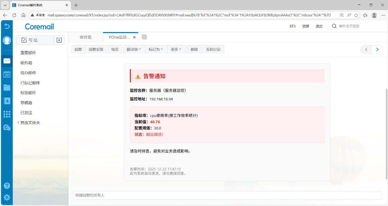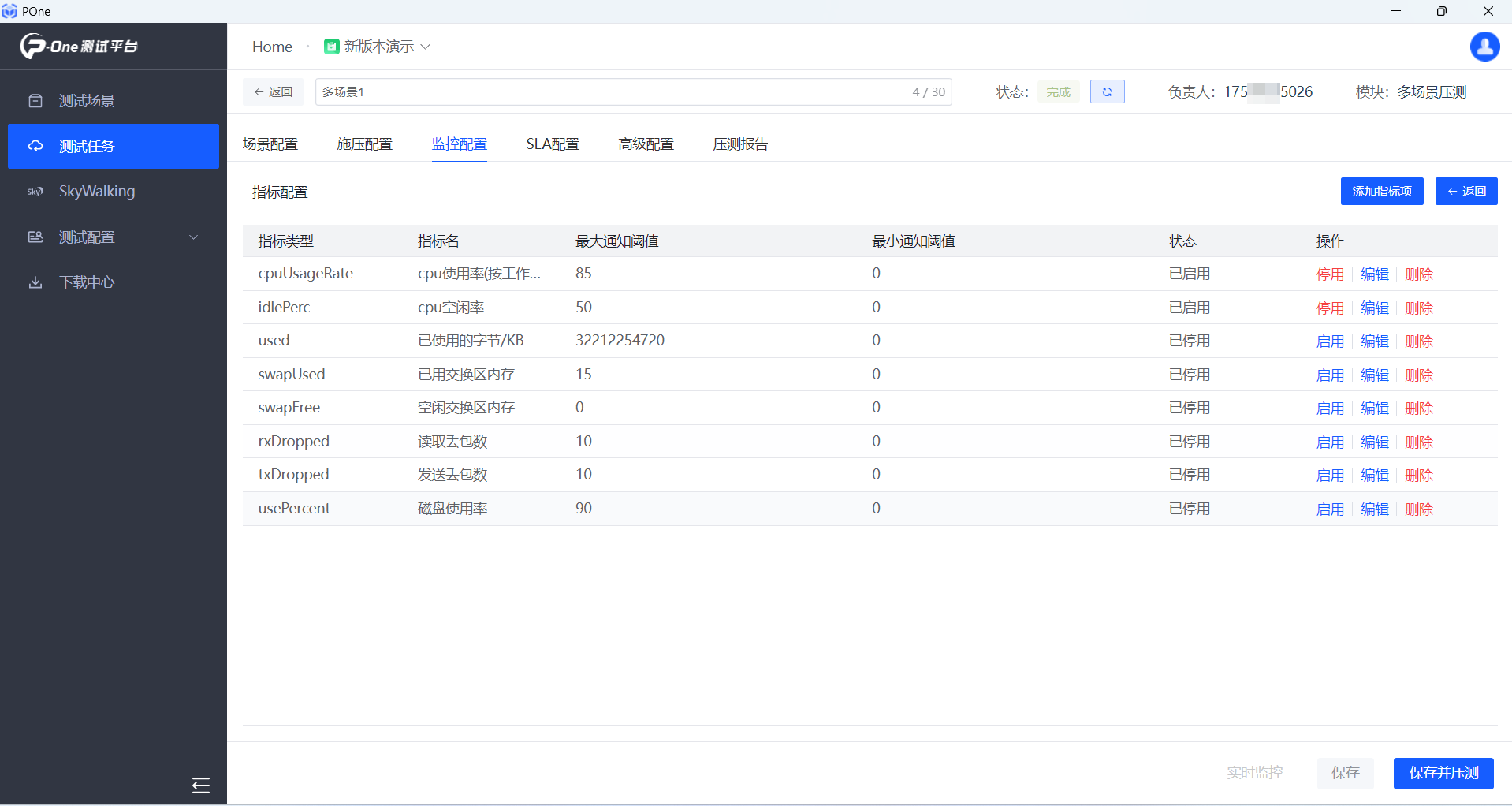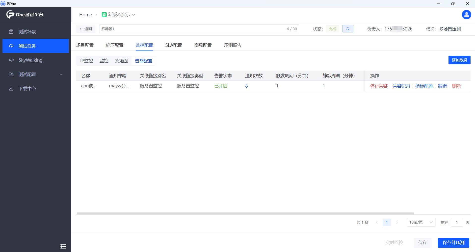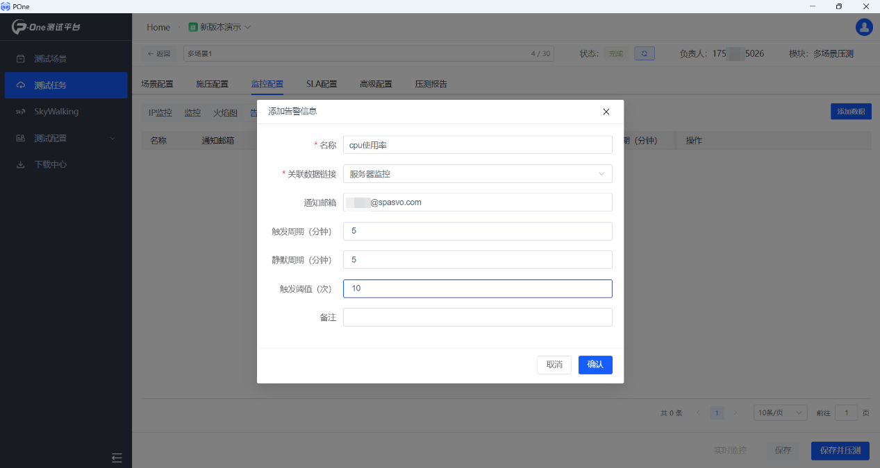 其次,新增監(jiān)控告警功能,監(jiān)控時可設(shè)置閾值,壓測過程中超過閾值會自動報警。我們在壓測時,監(jiān)控某個性能指標(biāo)時,提供設(shè)置閾值,監(jiān)控達(dá)到閾值,POne自動以郵件方式推送報警信息,及時提醒測試工程師。