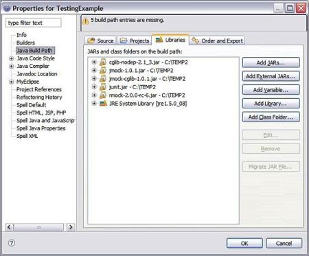 圖 2. 已添加到 TestingExample 項(xiàng)目中的 jMock 和 RMock JAR