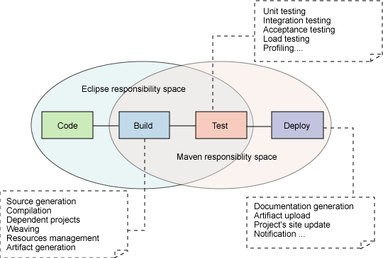漸漸地,一些工具開始假定某些特性可以完全并且順利地集成在一起,Maven 和 Eclipse(即使作為一個簡單的 IDE)也不例外。因此,從構(gòu)建的角度來看,二者似乎出現(xiàn)了重疊,如圖 1 所示。
