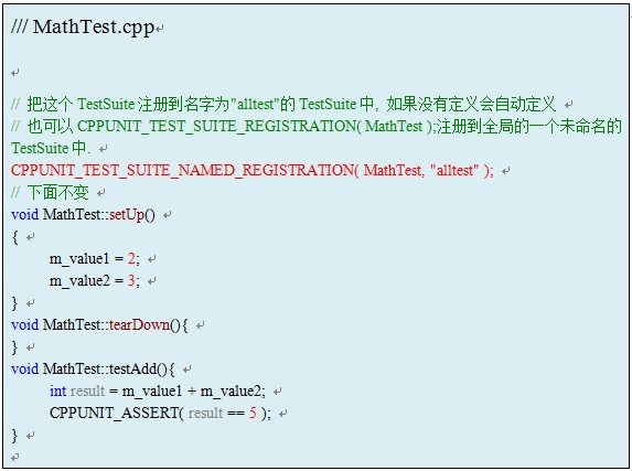 按照上面的方式,如果要添加新的測試用例,需要把每個(gè)測試用例添加到 TestSuite 中,而且添加新的 TestFixture 需要把所有頭文件添加到 main.cpp 中,比較麻煩。為此 CppUnit 提供了 CppUnit::TestSuiteBuilder,CppUnit::TestFactoryRegistry 和一堆宏,用來方便地把 TestFixture 和測試用例注冊到 TestSuite 中。下面是通常的使用方式(注意紅色字體):