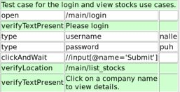 查看股票頁(yè)面顯示一個(gè)公司列表。用于這個(gè)頁(yè)面的測(cè)試用例非常簡(jiǎn)單,所以被包括在前一個(gè)測(cè)試用例的后面。該測(cè)試用例驗(yàn)證當(dāng)前位置是否為 /main/list_stocks,以及頁(yè)面是否包含文本 Click on a company name to view details。