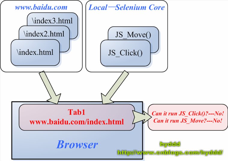 上面說了同源策略,那同源策略的Selenium Server有什么關(guān)系呢??呵呵,上一篇說過,Selenium Core是一堆JS函數(shù)的集合,它是我們操作瀏覽器的基礎(chǔ)。當(dāng)存在同源策略時,便出現(xiàn)一些問題,看下圖:
