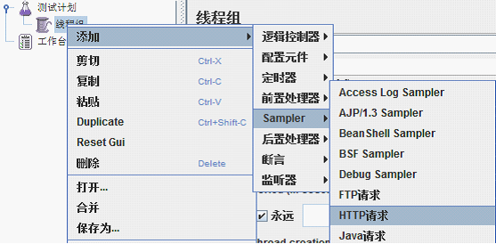 添加完成線程組后,在線程組上右鍵菜單(添加--->Sampler--->HTTP請(qǐng)求)選擇HTTP請(qǐng)求。對(duì)于jmeter來說,取樣器(Sampler)是與服務(wù)器進(jìn)