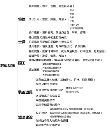 對戰(zhàn)系統(tǒng)解構的模塊有:將領、士兵、國王、裝備、城池。每個模塊縱向拆分成:基礎(基準/差距)、提升(方法/難度/支出等)、操作方法等。